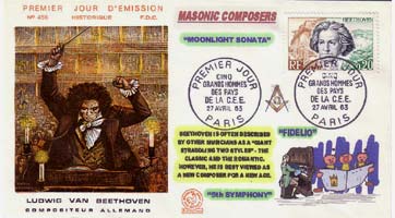 Voici le seul timbre réalisé par la Poste Française qui représente le compositeur. Il a été émis le 27 avril 1963. Ce timbre est le premier d'une série de 5 grands hommes de la CEE : Ludwig van Beethoven (0,20 F), Émile Verhaeren (0,20 F), Giuseppe Mazzini (0,20 F), Émile Mayrisch (0,20 F) et Hugo de Groot (0,30 F). Le timbre de Beethoven porte le numéro 1382 dans le catalogue Yvert et Tellier, le numéro 1432 dans le catalogue Michel, et le numéro 1059 dans celui de Scott. |