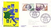 Elle porte pour mention, sur l'oblitération : "Cinq grands hommes des pays de la CEE - 27 avril 1963 - Paris". Chaque timbre de cette série est présenté sur une enveloppe illustrée avec le drapeau du pays d'origine du grand homme, et un monument. |