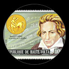 "Année internationale de la jeunesse" : bloc avec trois timbres, portant le sigle de l'UNESCO. Beethoven apparaît sur le bloc et non le timbre, avec d'autres peintres et compositeurs. |